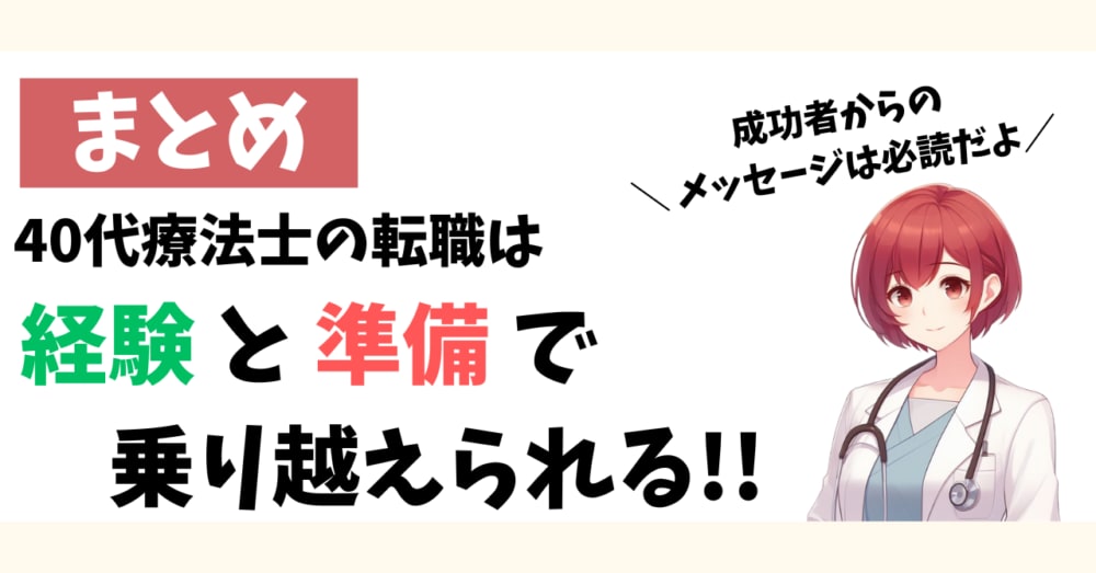 ここまで、40代リハビリ職の転職実態について、良かったこと、想定外の苦労、そして成功のためのヒントを見てきました。